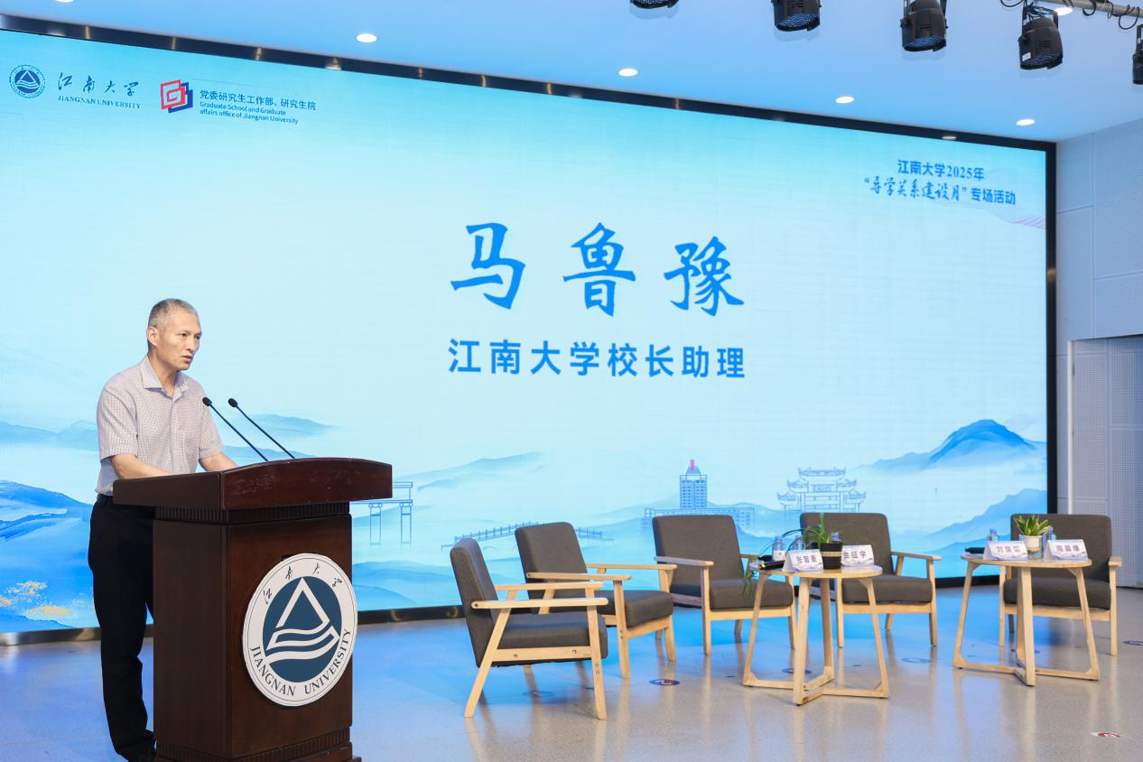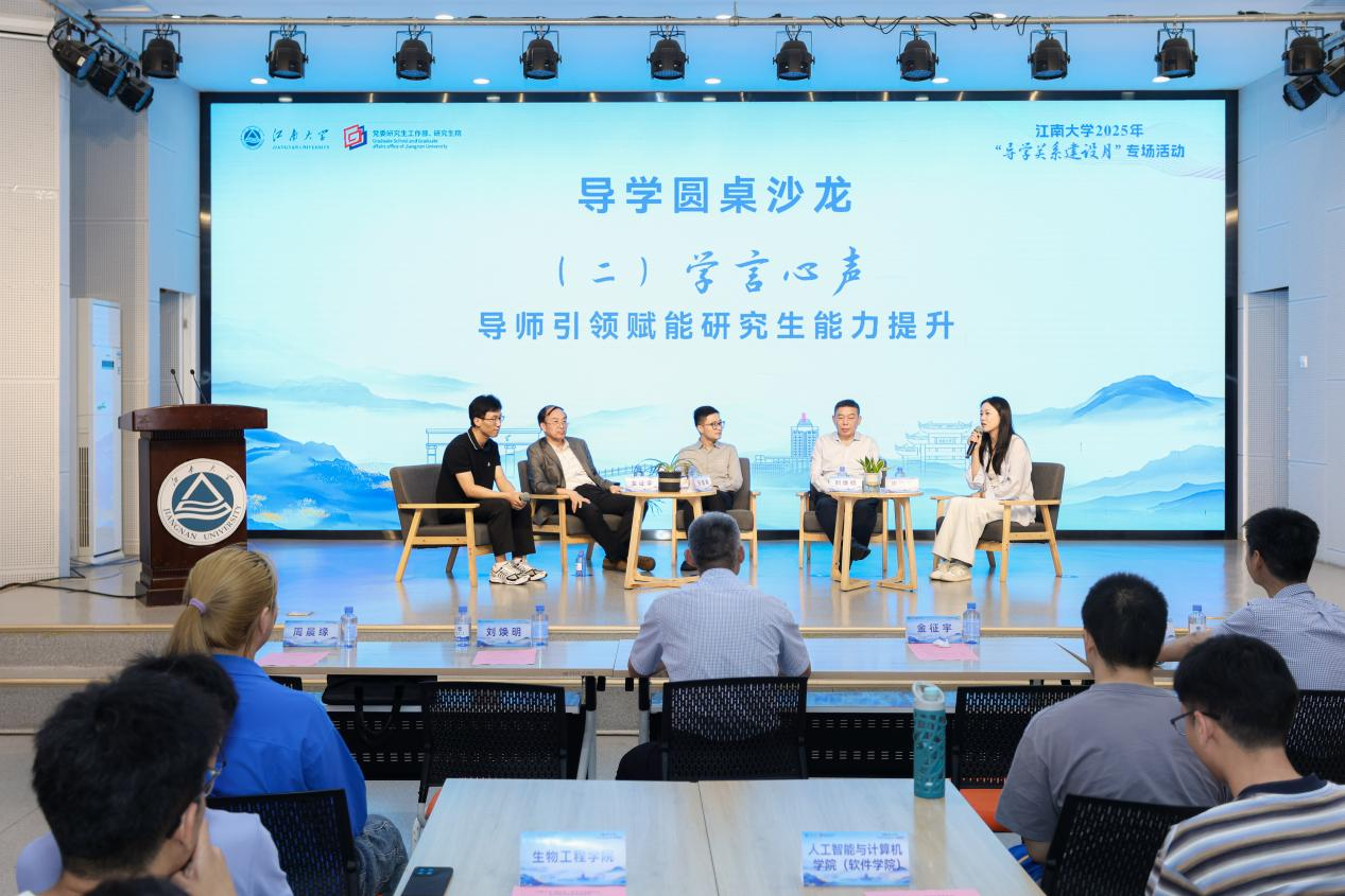 5月26日下午,江南大学2025年“导学关系建设月”专场活动——导学圆桌沙龙在蠡湖校区北区大学生活动中心F105圆满举办。本次活动特邀中国工程院院士、江南大学食品学院教授、博士生导师金征宇,江南大学马克思主义学院学科带头人、二级教授、博士生导师刘焕明,以及食品学院2023级博士研究生张智衡,马克思主义学院2023级博士研究生周晨缘作为访谈嘉宾。江南大学校长助理马鲁豫,党委研究生工作部副部长、研究生院副院长陈周,各学院研究生导师代表、研究生辅导员、研究生代表,党委研究生工作部工作人员参加活动。活动由卓越工程师学院教师陈裕主持。