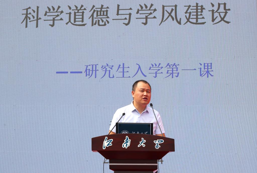 为贯彻落实教育部、省教育厅关于研究生科学道德和学风建设有关精神,引导研究生树立远大科学理想、弘扬科学精神、坚守学术诚信、维护学术尊严,9月24号上午,研究生院面向全体在校2022级博士、硕士研究生新生开展科学道德与学风建设宣讲报告会,做好研究生新生入学“开学第一课”,报告会邀请到了江南大学机械工程学院院长、博士生导师、国家级青年人才赵军华为主讲,会议由研究生院院长吴小俊主持,研究生院副院长姚文生及研究生院全体科级干部参加了报告会。