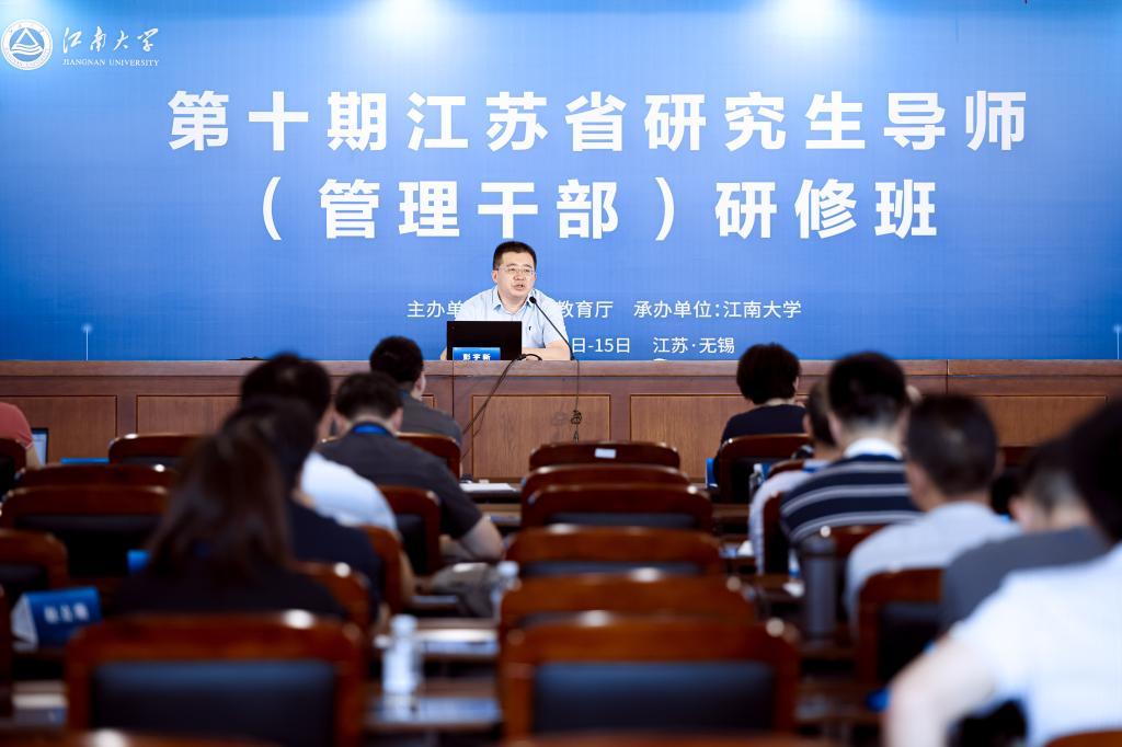 为深入学习贯彻习近平新时代中国特色社会主义思想和习近平总书记关于建设教育强国的重要讲话精神,认真贯彻中央和省委关于开展主题教育的部署要求,扎实落实《教育部关于全面落实研究生导师立德树人职责的意见》要求,7月11日,第十期江苏省研究生导师(管理干部)研修班在我校顺利举行。本期研修班由江苏省教育厅主办,江南大学承办。来自全省研究生培养单位的近80名研究生导师(管理人员)参加此次研修班。党委研究生工作部部长、研究生院院长,本期培训班班主任吴小俊教授主持会议。