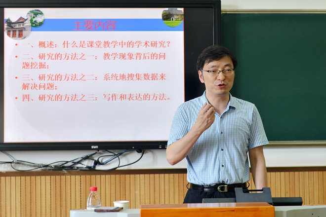 吕林海教授首先追溯了大学教师职责的演变,回顾了“教学学术”产生的背景,再次强调了卡内基教学促进会前主席欧内思特·博耶提出的“教学本身也是一种学术”、“大学的教学应当具有研究性,教学和研究之间应当是同生共进的关系”等观点。吕林海教授认为教学学术就是一种对日常课堂教学进行研究的学问,包含四大内容:课程体系(如课程方案、课程目标、课程内容、课程评价、课程结构等)、教学方法(如合作教学、讲授教学、技术支持的教学、教学环境)、学习特征(如学习方法、学习特点、学习发展)和其他方面(如教师发展、科研与教学的关系、师生关系等),这些都是日常课堂教学可以研究的内容。接着,他系统地向广大师生分享了自己教学学术研究过程中总结的三大方法,即:教学现象背后的问题挖掘、系统地搜集数据来解决问题、写作和表达的方法。针对三种方法吕林海结合自己的研究案例进行了详细讲解。他认为:研究的方法之一,是找到现象背后值得研究的问题,这是“做好教学学术研究”的第一步,是非常重要的,同时提出了问题挖掘的两个关键要素是观察和反思;研究的方法之二,是系统地搜集数据是问题提出后的关键步骤,他详细介绍了定量的问卷调查、定性的访谈与观察以及定性的文本分析三种具体方法;研究的方法之三,就是研究成果的表达和写作,吕林海结合自身的学术论文撰写经验,从论文整体形态、基本结构和基本要求三方面提出了详细的建议。