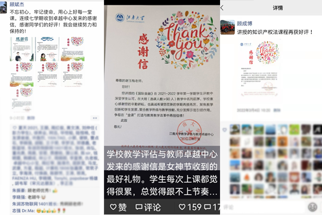 教学评估与教师卓越中心立足正向激励,探索以学生主体、教师回位、互动发展为特征的学生评教制度,从2019年开始对每学期各学院学生评教成绩优异的教师发放感谢信,累计表彰教师1121人次,涉及596门次课程,为学校先进教学学术理念和教学质量文化的积淀提供强有力的支持。