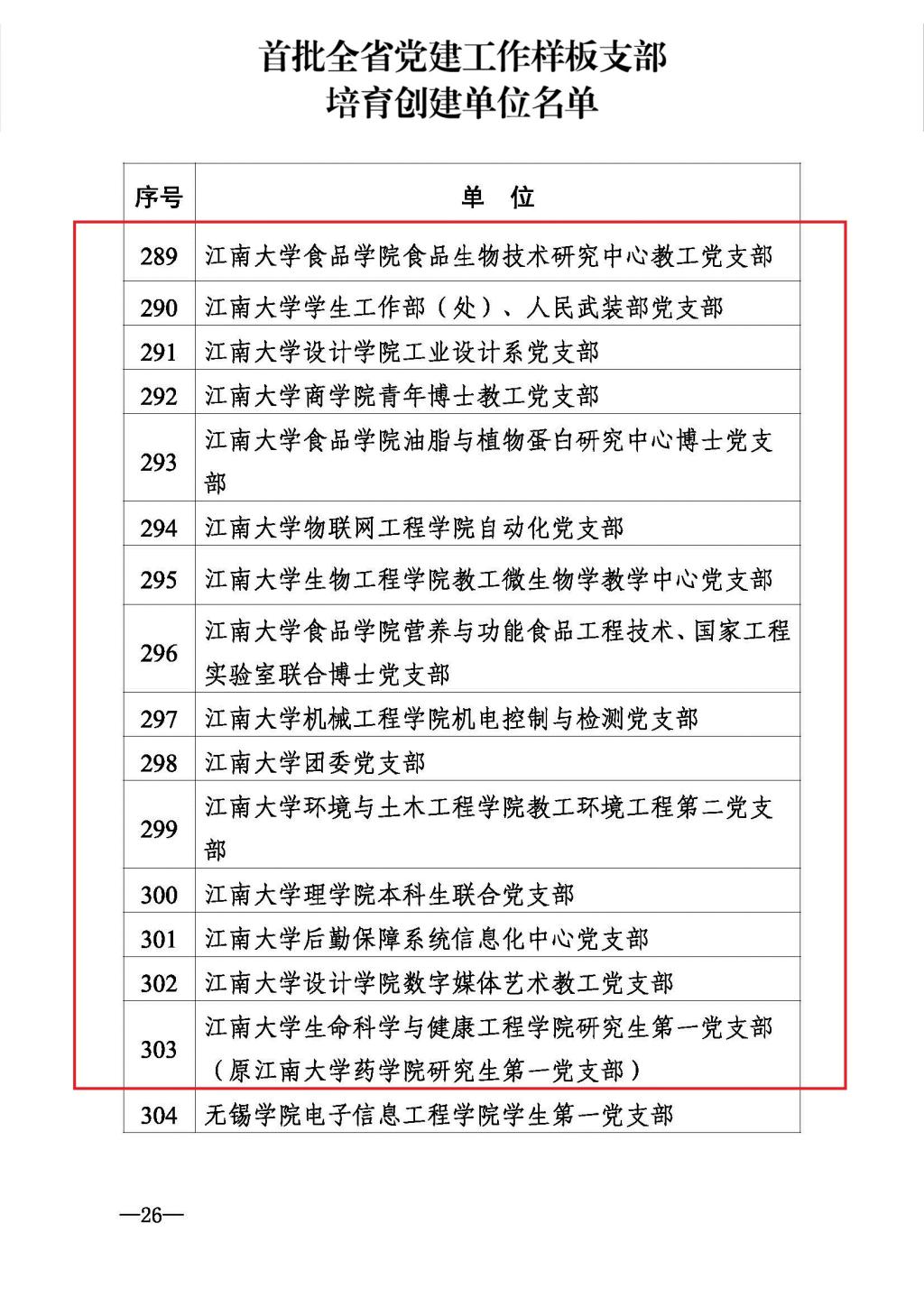 日前,江苏省委教育工委印发了《关于公布首批全省党建工作示范高校、标杆院系、样板支部培育创建单位名单的通知》(苏委教办函〔2022〕13号),我校纺织科学与工程学院党委入选“首批全省党建工作标杆院系”培育创建单位,食品学院食品生物技术研究中心教工党支部等15个党支部入选“首批全省党建工作样板支部”培育创建单位。