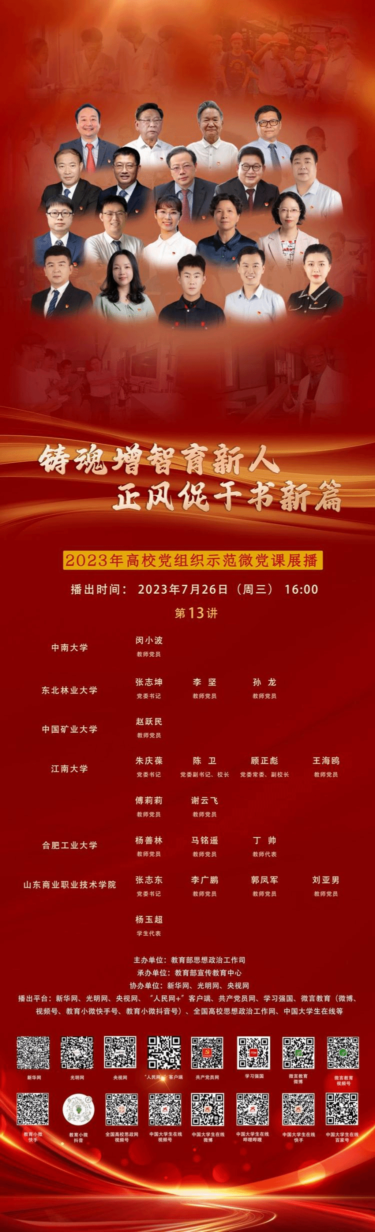近日,由教育部思想政治工作司主办,教育部宣传教育中心承办的2023年高校党组织示范微党课第13期开讲,我校和中南大学、东北林业大学、中国矿业大学、合肥工业大学、山东商业职业技术学院等学校讲授微党课。校党委书记朱庆葆、校长陈卫、副校长顾正彪和食品学院党委相关教师代表江南大学呈现了一堂“自立自强 筑牢食品科技强国梦”的主题党课。