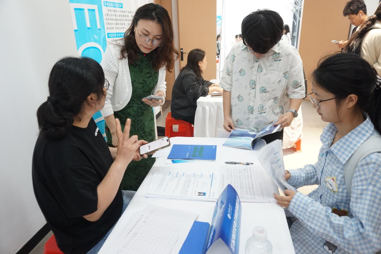 招聘会现场气氛热烈,来自江阴霞客湾校区、蠡湖校区的学生手持精心准备的简历,主动与企业沟通岗位细节。华勤技术、力芯微电子等企业展位前排起长队,“新质生产力”企业受到毕业生热捧。学校同步设置简历指导、生涯咨询服务点,由专业教师提供一对一就业指导服务。