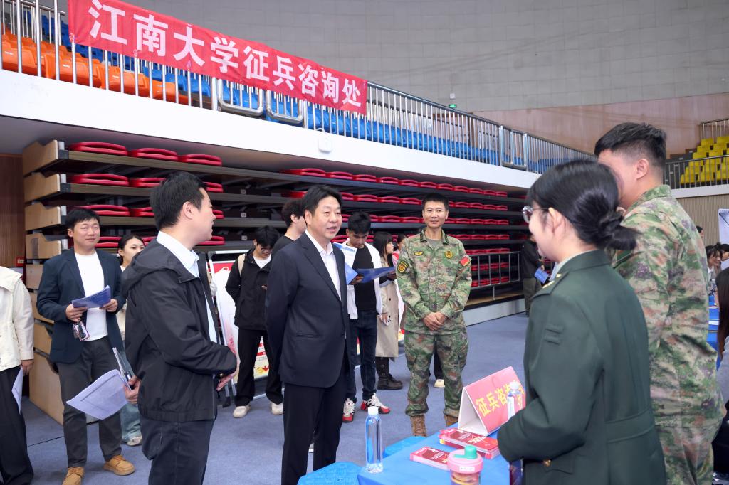 10月19日,江南大学2026届毕业生秋季大型招聘会在校体育馆举行。学校人民武装部会同滨湖区人民武装部,在会场设置征兵政策咨询台,开展2026年征兵宣讲,拉开新一年度校园征兵序幕。