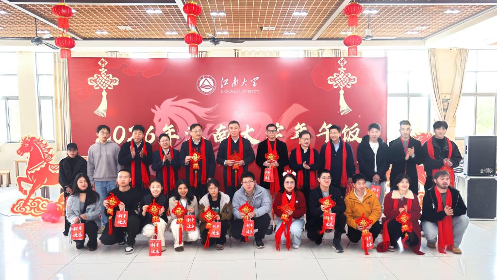 农历腊月廿七,年味正浓、暖意融融,2月14日,江南大学2026年留校学生春节午宴在蠡湖校区一食堂江南苑二楼温情开席。为留校学子筹办新春团圆宴,是学校延续四十余载的暖心传统,今年这份跨越时光的校园温情依旧如约而至。无锡市副市长张镇,市政府副秘书长顾文龙,市委教育工委书记、市教育局局长宋新春,江南大学党委书记吴正国,校党委副书记倪松涛,校党委常委、副校长戴月波出席活动,学校各职能部门、学院相关领导、教师代表与200余名留校学子欢聚一堂,共话团圆、喜迎新春。