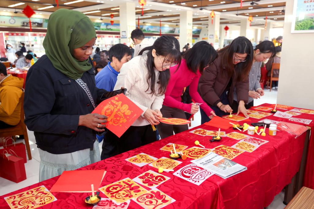 午宴现场张灯结彩、欢声笑语,处处洋溢着温馨团圆的节日氛围。现场特设手写春联、福字拓印、非遗糖画等民俗体验区,非遗传承人现场展艺,惟妙惟肖的生肖糖画引得师生驻足称赞,同学们在沉浸式体验中品味中华优秀传统文化的独特韵味。抽奖环节将现场氛围持续推向高潮,市、校领导为学子们抽取“暖心江南”“向阳而行”“满心呵护”等多轮幸运礼品。每位到场师生还收获了由校友企业春羽生物科技赞助的法蓓恩身体精华乳,这份暖心礼品承载着江南人饮水思源的深厚情怀。今年留校学生群体尽显国际化特色,来自全球30个国家和地区的留学生与中国学子一同体验中国传统年俗,在浓郁的江南年味中感受中国春节的喜庆与祥和。午宴期间,“一带一路”丝路项目留学生带来合唱《相亲相爱》,悠扬的歌声传递出“天下江南人是一家”的温暖情愫,赢得全场热烈掌声。