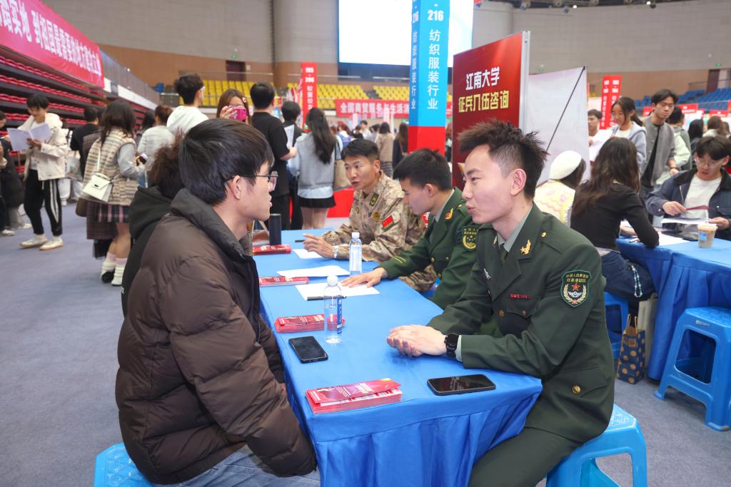 3月29日,我校2026届毕业生春季大型招聘会在蠡湖校区体育馆顺利举行。学校人民武装部在现场设立征兵政策咨询专区,组织我校退役大学生士兵参与现场工作,开展 2026年征兵宣传服务,为毕业生搭建政策咨询、入伍规划的便捷平台,持续推进年度征兵精准动员工作。