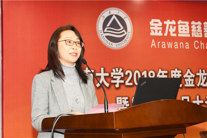 1月7日下午,江南大学2018年度金龙鱼奖学金、青年教师奖颁奖典礼暨“江南食品大讲堂”第九期主题报告会在图书馆5楼报告厅举行。益海嘉里集团研发中心总监、丰益(上海)生物技术研发中心有限公司总经理徐学兵,益海嘉里集团研发中心副总监、丰益(上海)生物技术研发中心有限公司副总经理姜元荣,益海嘉里集团研发中心资深研究员牛其文、江南大学党委副书记戴月波,社会资源处处长黄敏,学生工作处处长张菁燕,研究生院副院长武美萍,食品学院、生物工程学院、化学与材料工程学院党委副书记,以及获奖师生、学生代表等300余人参加颁奖典礼。颁奖典礼由研究生工作部副部长单筱婷主持。