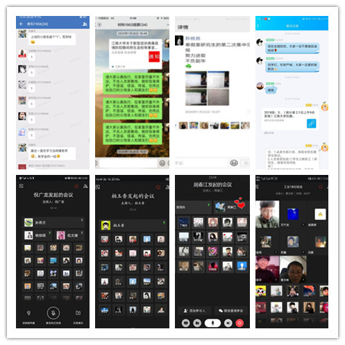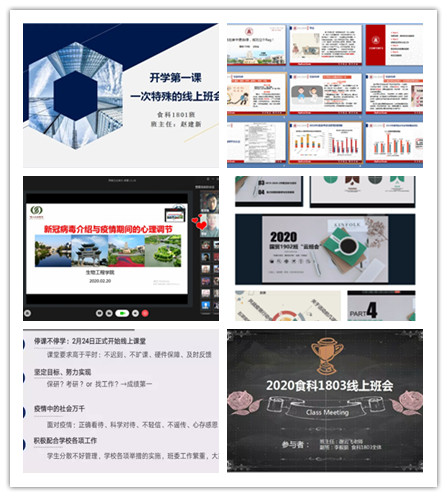 为了加强疫情期间的思想教育,班主任们纷纷争当主播,集思广益,创新开展线上班会。有的班主任为了优化班会效果,还特地准备了高清摄像头和降噪麦克风。“为了自身和他人的安全健康,请同学们一如既往,不松劲、不泄气,坚持不出行,按照学校的统一部署,要坚持、坚持、再坚持。”基地1901班班主任张梁通过企业微信向同学们叮嘱。为了配合国内同学的时间,在加拿大探亲的食质1902班班主任王文龙在当地时间23:00仍与班级连线,一向以“幽默”著称的王老师还走心地在中国地图上标出了班里32个同学的位置,说这是“食质1902的地图”。杨艳老师作为日语1703班班主任,与全班同学召开了一次“云班会”,鼓励大家要以积极正确的心态面对疫情,做科学的传播者、谣言的粉碎者、健康的守护者。