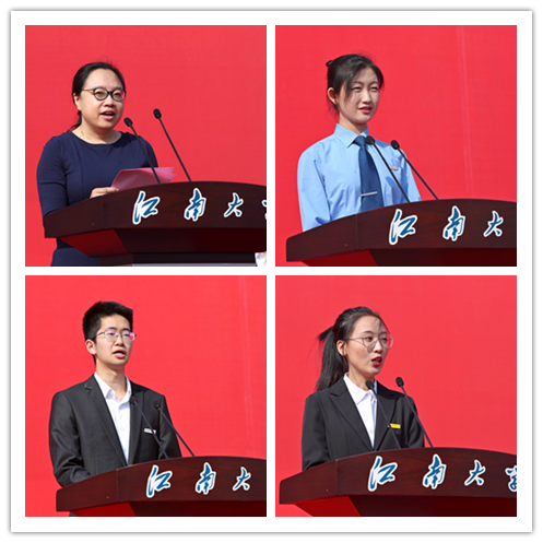 食品学院谢云飞教授代表全体教师发言,她期望全体新生能够仰望星空,树立远大抱负;脚踏实地,注重知行合一;心态阳光,练就强健体魄,以奋进之姿,成就江南人的“青春”荣光。商学院贺李同学代表在校生发言,她分享了自己参加庆祝中华人民共和国成立70周年阅兵的故事,勉励学弟学妹们把江南大学当做梦想的启航地,肩负时代使命,不负青春韶华。设计学院陈俊奕代表本科生新生发言,呼吁同学们要心怀大志,敢为人先,以斗志昂扬的姿态度过无悔的青春。化学与材料工程学院程琳代表研究生新生发言,倡议同学们应该主动思考、勇于实践,通过不断的学习将自己打造成一块对国家有用的“好材料”。