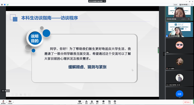 讲座后,学生工作部线上举行了新生心理普测专题会议。董霞通报了2021级学生心理测试总体情况,提出了心理测试预警学生帮扶工作的要求。童玉梅详细讲解了针对本科生预警学生和研究生预警学生的约谈流程,以及约谈的注意事项。会议简短而高效,促进了心理健康工作队伍专业知识和实践经验的交流,有利于掌握学生心理健康状况,有针对性地开展心理危机干预,形成全员育人工作格局。