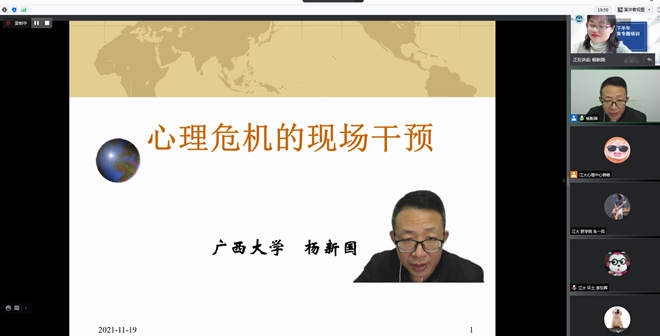 培训开始,广西大学心理健康研究所所长杨新国研究员线上作《危机的现场干预》讲座。杨新国结合多年危机干预的工作经验及深厚的理论功底,着重介绍了10项干预技术,包括借助姓名建立关系、倾听和共情、发现社会支持系统、询问未完成事件等。他指出,在现场干预中,也需要杜绝14项很容易犯的错误,如批评指责、讨论对错、忘记跟踪记录等。最后,杨新国通过一个真实的危机案例,详细讲解了危机干预中的各项技术和注意要点。杨新国温文尔雅、妙语连珠,讲座深入浅出、实操性强,使参训老师对危机干预工作有了更加全面的认识和理解。