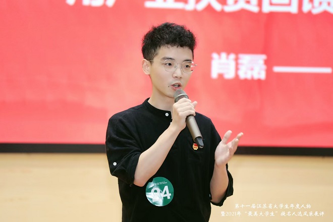 在第十一届“江苏省大学生年度人物”暨2021年“最美大学生”推选现场风采展示环节,肖磊以“江水之下,热忱之上”为题,从“三峡川江,点燃梦想之光”之维,讲述他如何与百万三峡移民一起,舍小家、为大家奔赴异乡;从“江南星河,照亮创业征途”之维,讲述了他与五个同样来自于三峡地区的移民同行创业,探索“授渔造血”的三峡品牌设计扶贫模式,用专业能力致行内陆发展的故事;从“家国有梦,铸就设计理想”之维,讲述他响应国家号召,投身中国航天精航智造、山河智能国际工程机械设计等大国重器项目的设计。最终,肖磊凭借饱含感召力的先进事迹、富有感染力的现场展示获江苏省高校本科组展评成绩第一名。