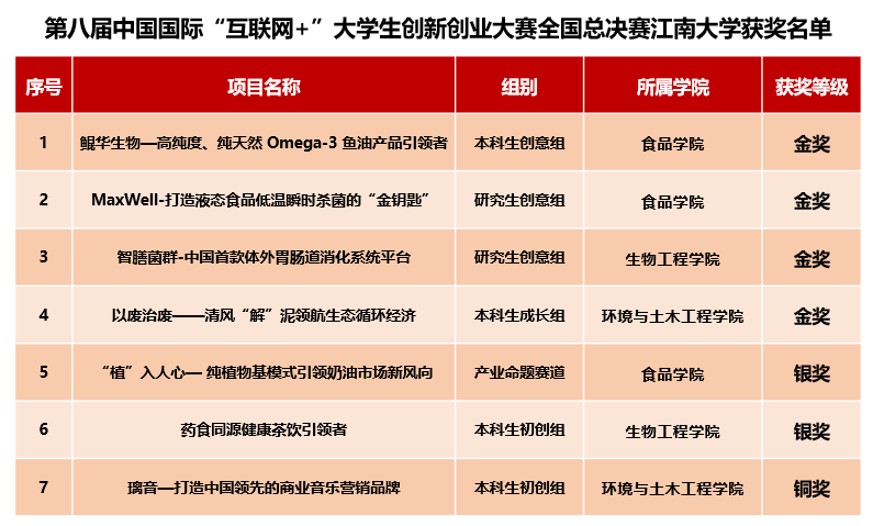 日前,第八届中国国际“互联网+”大学生创新创业大赛全国总决赛胜利落下帷幕。经过激烈角逐,我校在大赛中斩获金奖4项、银奖2项、铜奖1项,金奖总数并列全国第12、全省第4,创造了我校在该项赛事中的历史最好成绩。本次大赛,学校实现多个突破,首次实现3个金奖项目以小组第一入围全国四强争夺赛,首次实现在校本科生、硕士生、博士生和毕业校友同时获金奖,首次实现产业赛道项目入围总决赛。