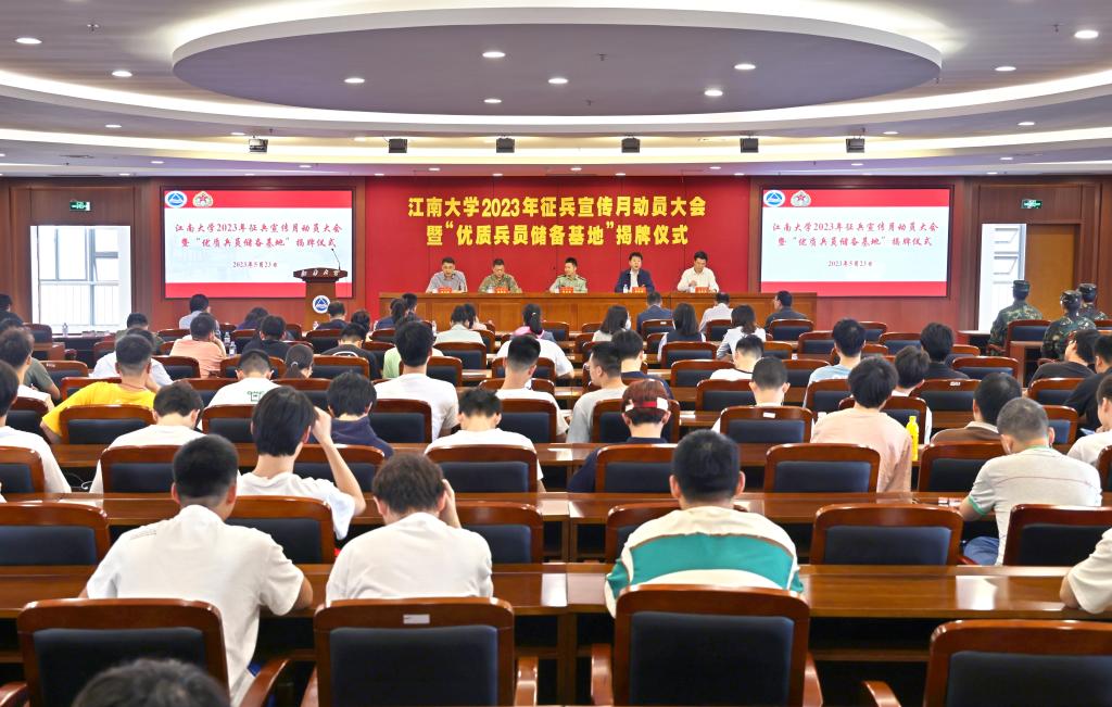 5月23日下午,2023年征兵宣传月动员大会暨“优质兵员储备基地”揭牌仪式在图书馆五楼报告厅举行。无锡军分区副司令员来全亮,江南大学党委常委、副校长倪松涛,滨湖区人民武装部部长滕晓启,江南大学人民武装部部长周伟涛出席会议,校国防教育领导小组成员单位的领导、各学院党委副书记、学工办主任、毕业班辅导员和学生代表参加会议。本次会议由江南大学人武部副部长俞立峰主持。