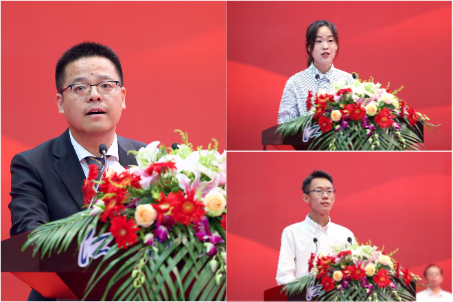 各学院院长为新生送上开学寄语,饱含着学院、老师对新生们的谆谆教诲和殷切期望,为新生们的大学生涯指引方向、注入动力。医学院程洋老师代表全体教师发言,他鼓励全体新生耕种理想的种子,坚定奋进的步伐,涵养家国情怀,将个人的发展融入国家富强和民族复兴大业之中。设计学院广茂池同学代表全体在校本科生发言,她呼吁新生们励学笃行,理智言思,让青春在奋斗中闪光;自立自强,勇于探索,让青春在时代洪流中孕育无限可能。生物工程学院张涛同学代表全体本科新生发言,他号召同学们以青春之名,扬奋进之姿,既要沉得下心埋头苦读,也能抬得起头正确认识世界之变、时代之变、历史之变,在时代洪流中找准自己的青春定位。