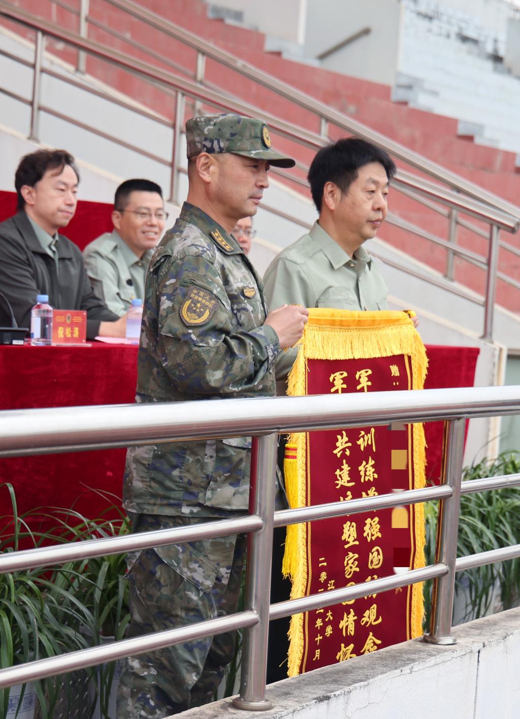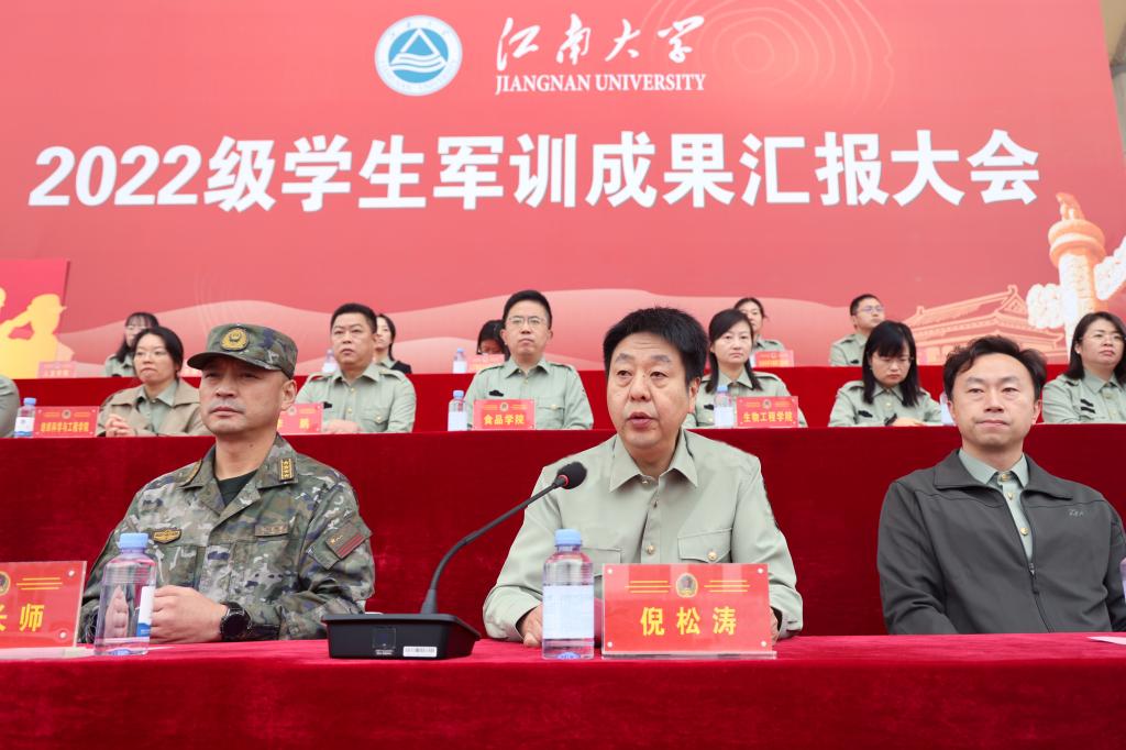 倪松涛发表讲话,他首先向全体参训并圆满完成任务的同学表示热烈的祝贺,向承训部门领导和官兵致以诚挚问候和崇高敬意,向带训辅导员、组织保障军训工作的全体老师表示衷心的感谢。他对全体参训同学提出三点希望:一是胸怀祖国,树立远大理想,坚定报国之志,努力成长为党和国家期盼的有志青年;二是苦练本领,继续发扬军训期间激昂奋进的精神,以更自信和更主动的状态融入社会;三是担当作为,在以后的学习生活中,将军营绿融入江南绿,为中华民族伟大复兴贡献青春力量。