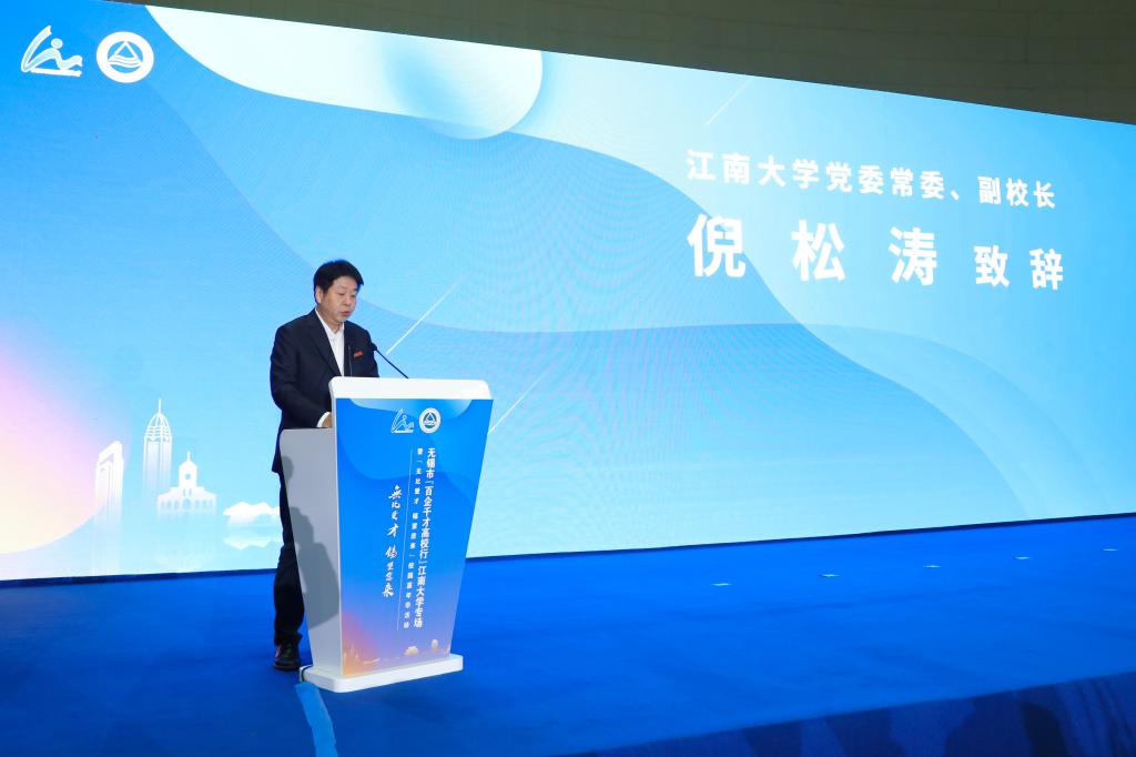 倪松涛在致辞中表示,今天的活动是一场春日人才交流和市校项目合作的盛宴,充分体现了无锡市委市政府对青年人才的强烈渴求和对江大学子的深情厚爱。他提出江南大学作为唯一一所本部及分校均设在无锡的教育部直属高校和“双一流”建设高校,始终与无锡唇齿相依、同兴共荣,市校共建有无限“锡”望,江南才美将优选无锡。他希望广大学生能够更加深入地了解无锡、感知无锡、热爱无锡,抓住家门口的工作机会,拿到满意的Offer。他表示,学校将进一步积极投入市校携手合作,在促进区域创新体系建设、加强高层次人才培养等方面同向发力,助力构建双向赋能创新格局,为谱写“强富美高”新无锡现代化建设新篇章贡献更多智慧和力量。