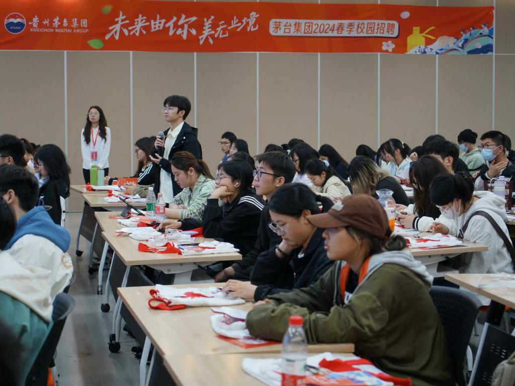 会后,双方来到北区活动中心F105茅台集团宣讲会现场。茅台集团党委组织部相关负责人进行了主题宣讲,详细介绍了茅台的发展历程、招聘计划、岗位要求,以及人才培养体系等学生们关心的问题。现场设有答疑和抽奖互动环节,气氛活跃,各子公司的咨询台前人头攒动,前来咨询的学生络绎不绝。