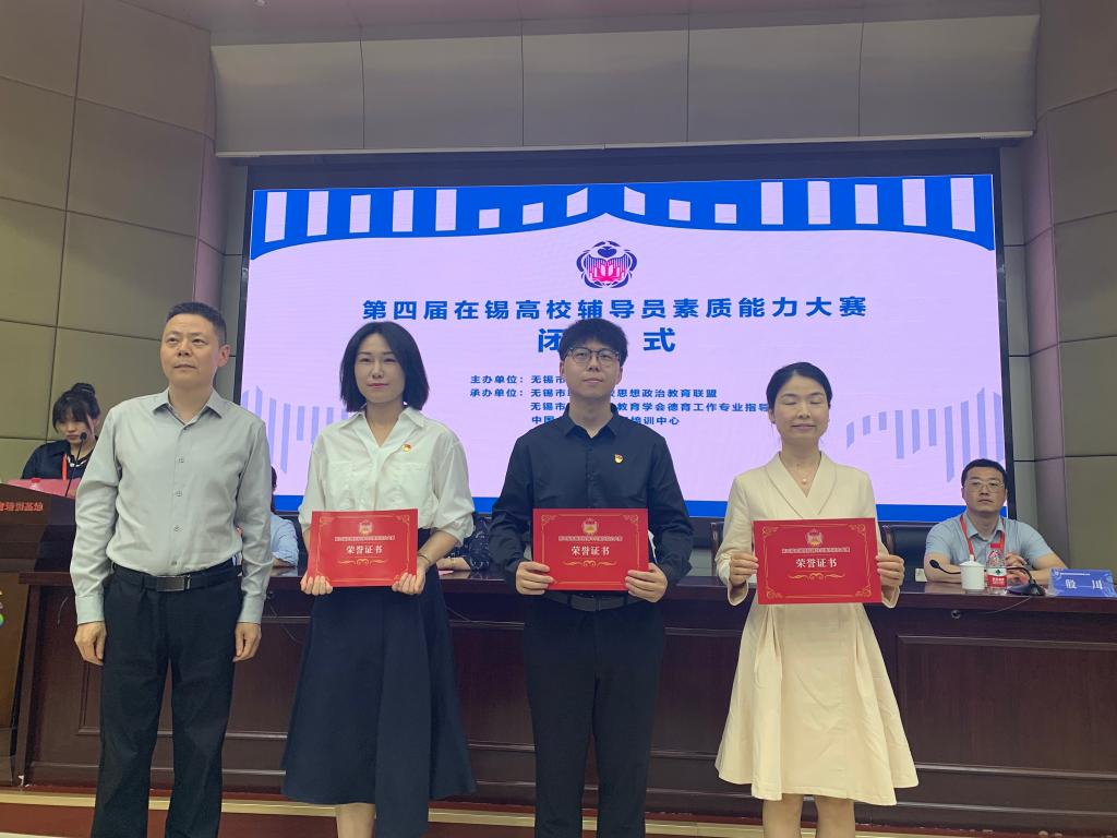 5月24-25日,由无锡市教育局主办,无锡市职业院校思想政治教育联盟、无锡市职业技术教育学会德育工作委员会、中国企业管理无锡培训中心承办的无锡市第四届在锡高校辅导员素质能力大赛成功举办。我校三名辅导员在大赛中斩获佳绩,其中,无锡医学院辅导员鲁钦正荣获一等奖,机械工程学院辅导员何涛荣获二等奖,商学院辅导员吴松荣获三等奖,我校荣获大赛“优秀组织奖”。