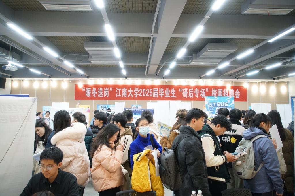 12月25日下午,“暖冬送岗”江南大学2025届毕业生“研后专场”校园招聘会在北区大学生活动中心举办。本次招聘会吸引了来自周边省市区的85家企事业单位积极参与,更有来自无锡惠山区的组团招聘,为学生提供2800余个就业岗位。