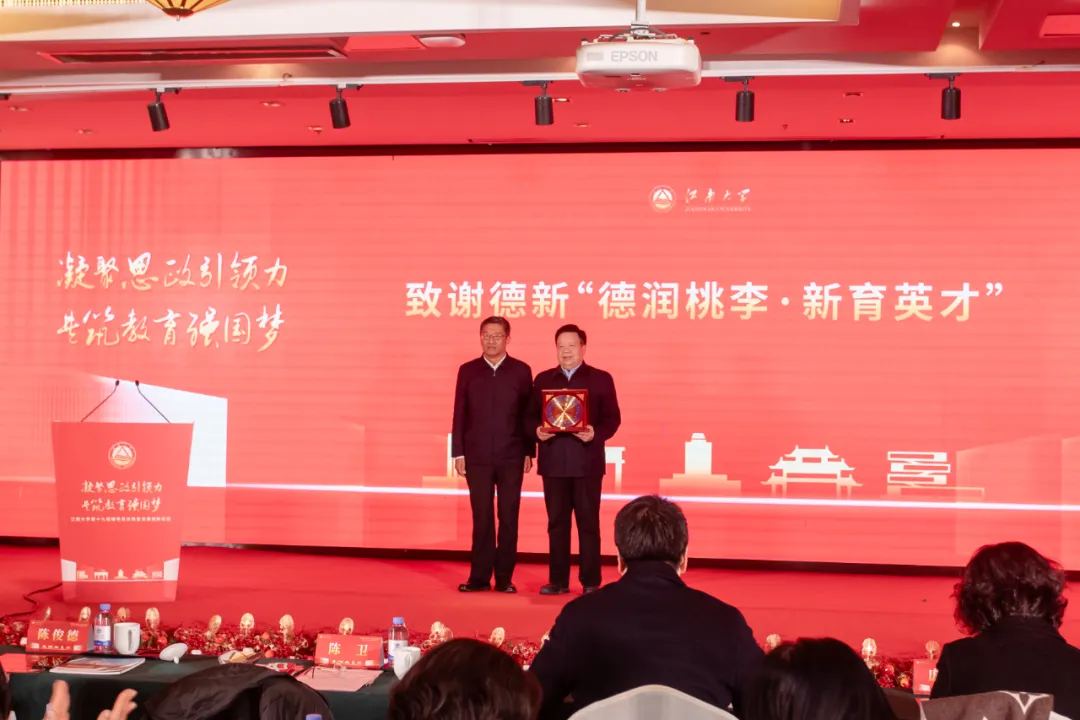 颁奖结束后,陈卫向德新教育基金捐赠人陈俊德颁发“德润桃李,新育英才”感谢牌。