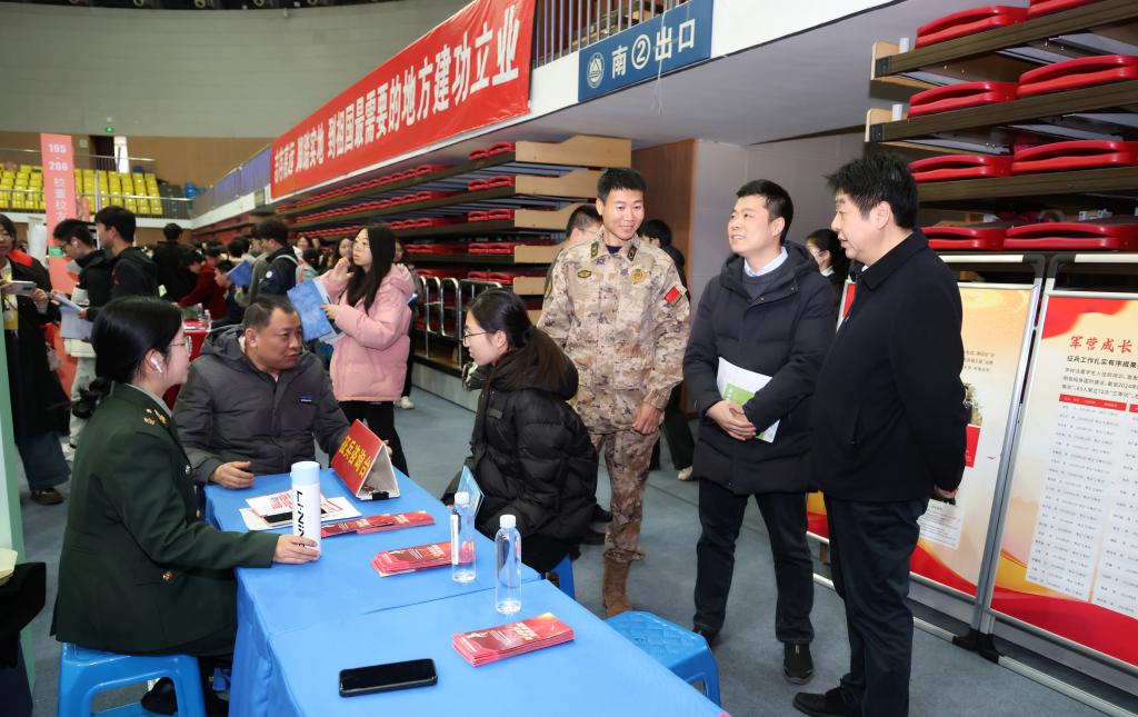 3月15日,人民武装部在学校体育馆的2025届毕业生大型招聘会现场开展征兵宣传活动。校党委常委、副书记倪松涛在人武部部长周伟涛的陪同下莅临现场指导工作。