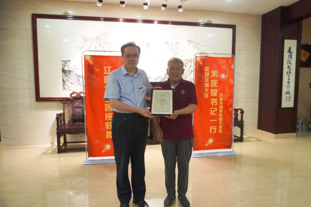 6月18日下午,江南大学客座教授聘任颁授仪式在宜兴毛国强紫砂艺术馆举行。校党委书记朱庆葆携党委办公室、党委宣传部、江南文化研究院主要负责同志,以及设计学院党政班子、教师代表等一行赴宜兴,为中国工艺美术大师、中国陶瓷艺术大师毛国强颁发江南大学客座教授聘书。省政府办公厅文史处处长丁骏,宜兴市副市长周斌,中国陶瓷工业协会副理事长、宜兴市陶瓷行业协会会长史俊棠等出席聘任仪式。仪式由设计学院党委书记邱建平主持。