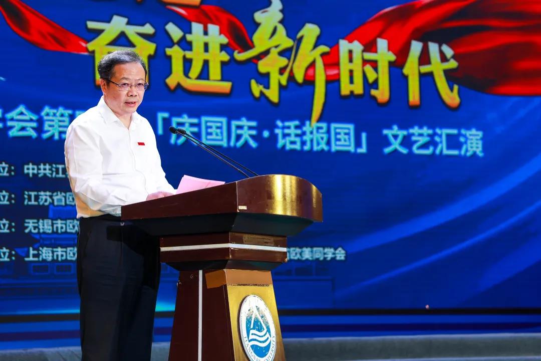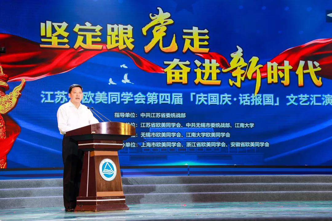 朱庆葆代表学校师生向长期关心和支持江南大学发展的各级领导、各界朋友,致以衷心的感谢。他指出,全省归国留学人员通过文艺汇演的方式,共同为伟大祖国庆贺,共同为伟大时代欢呼,共同为伟大事业点赞。希望我校欧美同学会进一步发挥桥梁纽带作用,凝聚广大归国留学人员,汇合智慧和力量,挥洒青春和汗水,凝心聚力奋进新征程,齐心协力构筑新优势,用“建功新时代、共圆中国梦”的实际行动,向祖国献礼、为祖国添彩。