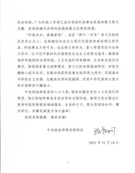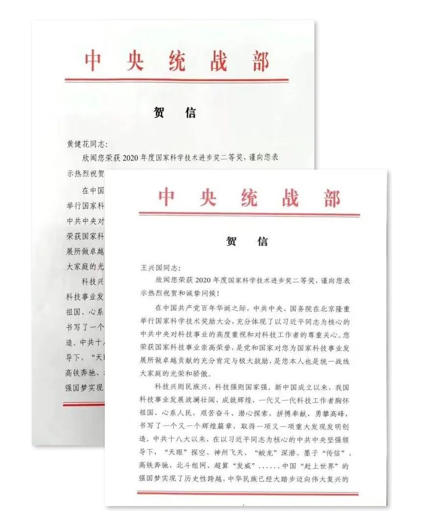 贺信中提到,两位党外人士荣获国家科技事业崇高荣誉,是党和国家对其为国家科技事业发展所作出卓越贡献的充分肯定与极大鼓励,也是统一战线大家庭的光荣和骄傲。