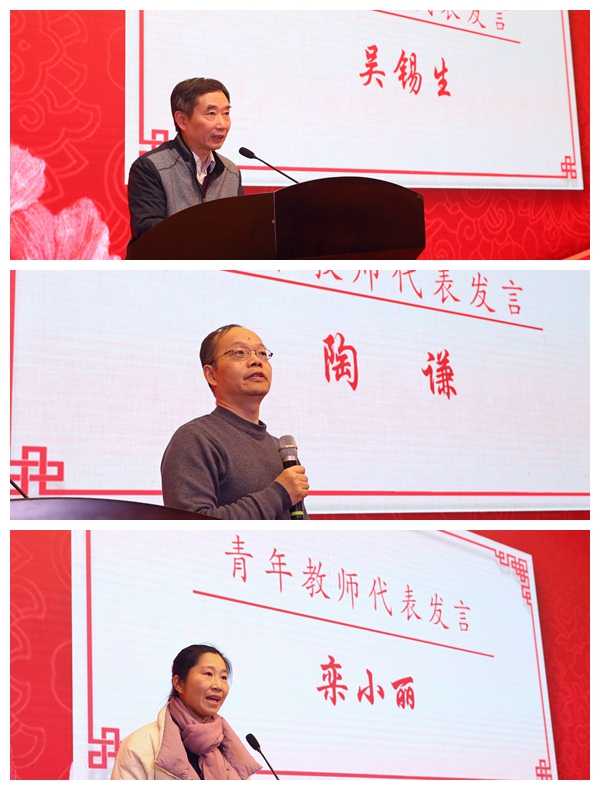 党委办公室吴锡生老师和食品学院陶谦老师分别代表荣休教师发言。他们从不同角度回顾了自己的工作历程,表达了对学校和教育事业的热爱之情,并表示将继续关心支持学校各项事业发展,也祝愿学校今后发展得更快更好。物联网工程学院栾小丽老师作为青年教师代表发言,她感谢前辈们在她从学生到博导的成长过程中给予的教导和付出,并表示青年教师的成长离不开前辈们的教导和帮助,今后将继续以前辈们为榜样,不忘初心,砥砺前行,在追求卓越的道路上永不止步。典礼上播放了离退休工作处制作的视频《岁月成诗流年凝画 最美岁月再度启航》,向荣休教职工展示了退休教职工老有所为、老有所依、老有所学、老有所乐的退休生活和乐观向上、热爱生活的精神面貌。学生代表向荣休老师献上自己创作的诗朗诵《江南意·桃李情》,以质朴深情的诗句表达了学子们对老师们辛勤栽培的感恩与谢意。