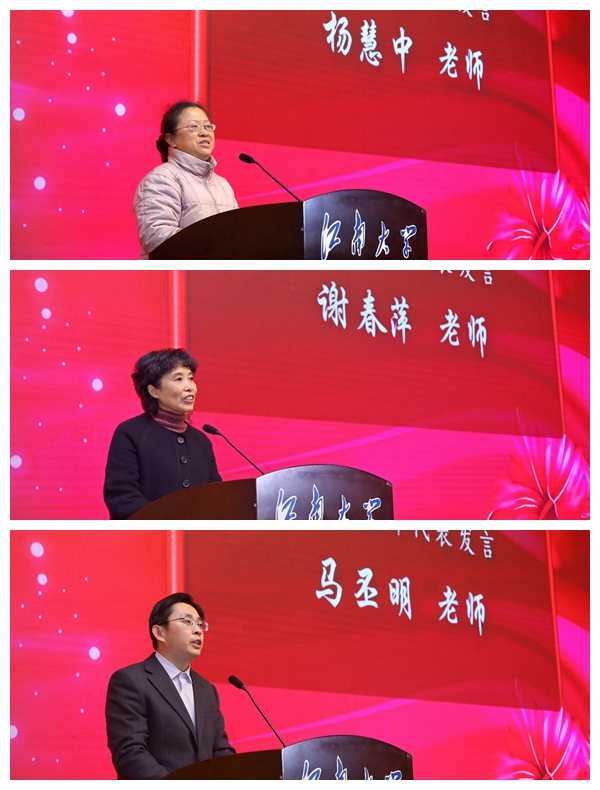 物联网工程学院杨惠中老师和纺织科学与工程学院谢春萍老师代表荣休教师发言,她们分享了各自在校期间的工作经历,表达了对学校和教育事业的热爱,同时也为学校几十年来取得的成就感到骄傲,质朴的话语中满含不舍和感激之情。两位老师表示,感谢学校为大家举行如此隆重的荣休仪式,退休后将一如既往地支持学校的建设,力所能及地为学校发展建言献策、尽心尽责。