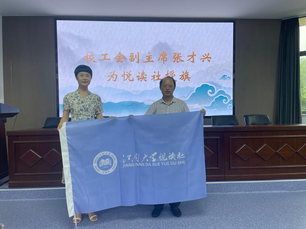 启动仪式最后,张才兴向江南大学教工悦读社授旗,教工悦读社成员在社旗下合影留念,期待老师们能在今后的社团活动中汲取知识与智慧,分享生活与温情,与书籍为伴、携书友同行。