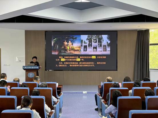 讲座从甲骨文“吴”字解析入手,对早期勾吴古国历史发展进行了梳理,以历史观点溯源论证了泰伯奔吴、周章受封、寿梦初霸、季子不居、专诸刺僚、阖闾称霸、夫差亡国等历史事件,用一个个历史故事串成早期勾吴古国的发展进程。讲座还对无锡城市文化品牌“太湖绝佳处,运河水弄堂。千年古吴都,百年工商城”进行了详细阐述,通过时间主线和历史事件,展示了无锡的历史长卷。在庄教授娓娓道来的婉转叙述中,老师们领略了吴文化的灿烂辉煌。