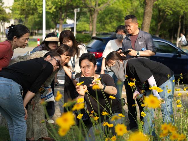 随后,王俊借助现场盛开的金鸡菊,为大家带来了一场生动的花卉拍摄技巧讲解。他结合自己丰富的拍摄经验,详细阐述了如何选择合适的拍摄角度、运用光线和色彩等因素来突出花卉的美丽和生命力。在王老师的指导下,大家纷纷拿起相机进行实践拍摄,现场氛围热烈,老师们积极参与,兴趣浓厚。
