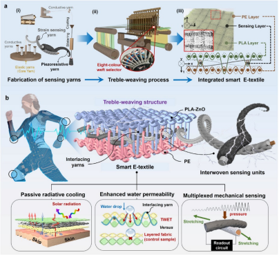 智能电子织物(e-textiles)因其在人体与环境交互中的独特优势,近年来受到广泛关注。然而,将优异的电性能与舒适的热湿调控能力高效集成于单一织物中,并实现工业化量产,仍是当前可穿戴技术落地面临的关键挑战。这些问题限制了智能电子纺织品在户外运动、长期健康监测等场景的应用前景。