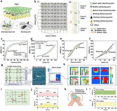 鉴于此,江南大学孙丰鑫研究团队基于“超构织物(meta-textile)”结构设计理念,开发出一种智能三重编织电子织物(TWET)。该织物不仅具备高灵敏度的多模态传感能力,还兼具红外辐射冷却与微液量的汗液快速传导等多重功能无缝集成,显著提升了穿戴过程中的热湿舒适性。这一“结构诱导功能”的超构织物设计理念,为新一代智能可穿戴设备提供了高度集成、可规模化生产的解决思路,展示出广泛的应用前景和工程化潜力,有助于推进可穿戴技术在户外运动、健康监测等领域的实际应用。相关成果以“Knot-Patterned Treble-Weaving Smart Electronic Textiles With Advanced Thermal and Moisture Regulation for Seamless Motion Monitoring”为题发表于《Advanced Functional Materials》(影响因子:18.5),江南大学纺织研究所研究生赵洁云为论文第一作者。