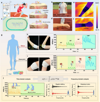 该研究提出了一种分层拓扑设计策略,将拉伸与压力传感、热调控与导湿功能无缝集成于一块可呼吸、贴合人体的智能织物中。所设计的TWET不仅能够精准监测人体运动信号,还具备卓越的定向导汗与红外辐射降温能力。通过正交交错的气泡型压阻纱与可拉伸纱线,该织物在压力与拉伸传感中表现出高灵敏度和稳定性。同时,借助交织纱线结构,有效引导汗液由PE层向PLA-ZnO层迁移并加速蒸发,从而维持皮肤干爽舒适。TWET还展现出出色的光谱选择性辐射特性,使织物实现了相比棉织物约10°C的被动降温效果。在实际应用中,该多功能织物传感器可稳定感知热应激下的人体运动行为,为智能穿戴设备在健康监测、高温作业和户外运动等场景的推广应用提供了可靠支撑与新思路。