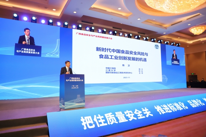 陈卫作了题为《新时代中国食品安全风险与食品工业创新发展的机遇》的主旨演讲。他指出,食品工业是国民经济的重要支柱产业、是保障民生的重要基础产业、是实现健康中国战略的重要力量,得到了党中央、国务院的高度重视。他强调,在党中央、国务院和广西壮族自治区党委、政府的坚强领导下,广西治理食品安全风险取得了积极成效,食品安全责任体系更加完善,食品安全形势稳定向好,食品产业规模不断扩大,食品品牌影响力持续增强,产品品质持续提升。