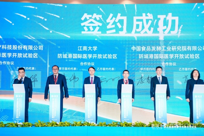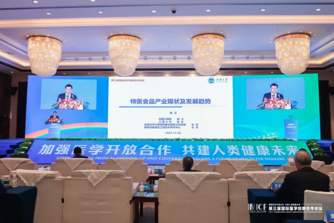 本届论坛包含开幕式、主旨演讲、分论坛、闭幕式等活动。论坛主旨演讲环节,陈卫从特医食品及法规政策、特医食品的产业存在问题与建议等方面作了《特医食品产业现状及发展趋势》主旨演讲。开幕式现场举行了项目签约仪式和揭牌仪式,黄敏代表江南大学与防城港国际医学开放试验区签署合作协议,陆文伟代表江南大学参加防城港国际医学开放试验区特殊食品技术成果转化中心揭牌仪式。