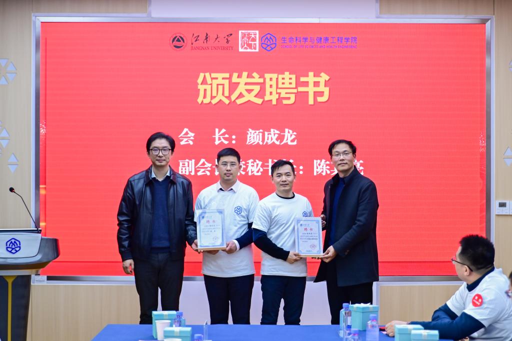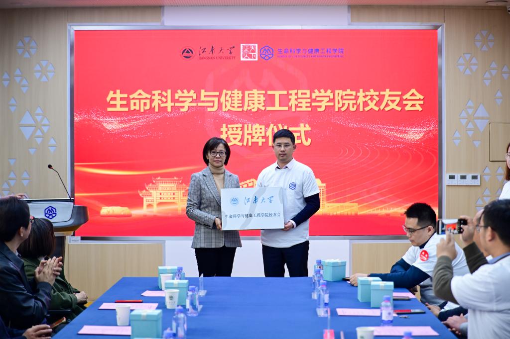 筹备组副组长蔡燕飞汇报生命科学与健康工程学院校友会筹备情况。周云龙宣读、大会审议通过生命科学与健康工程学院校友会组织机构成员名单。张影陆向新当选会长颜成龙授会牌并赠送江南大学文化书籍,周云龙向新当选秘书长陈其亮授会旗。史志洪、尹健为校友会组织机构成员颁发聘书。