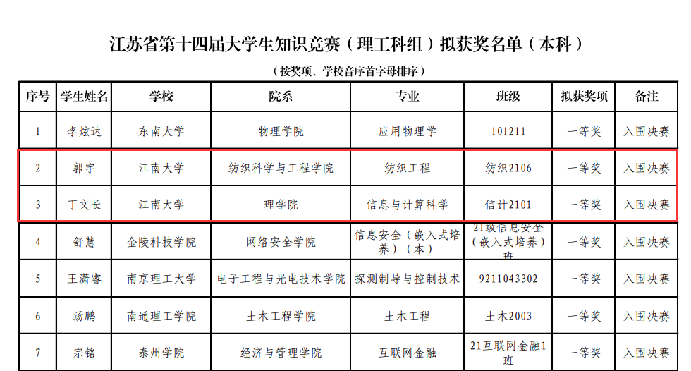 近日,江苏省第十四届大学生知识竞赛(理工科组)笔试成绩公布,我校共有75名学生获奖,其中一等奖2名,三等奖19名,优秀奖54名,获奖学生占参赛学生总数的38.86%。其中,来自纺织科学与工程学院的郭宇和来自理学院的丁文长同学顺利入围决赛,占全部7名入围决赛同学中的2席。