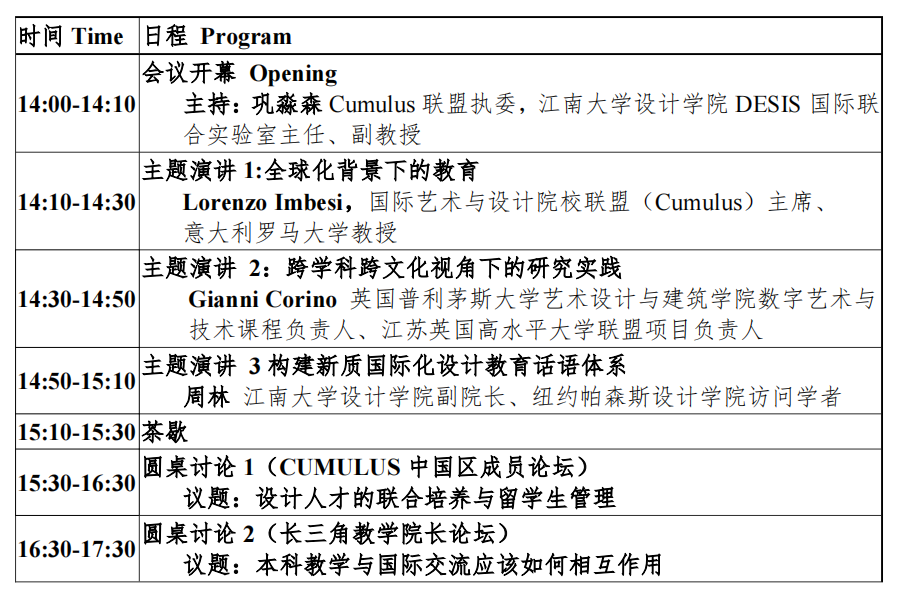 中国设计教育伴随全球化浪潮而发展。一方面我国当代设计教育是国际文化交流的产物,另一方面,经济全球化是设计教育蓬勃发展的时代动因。因此,设计和设计教育自带全球化的本质特征,全球化的潮汐必然推动设计教育的涌动。本次论坛旨在探讨如何面对在新的全球化浪潮中的挑战和机遇:如何有效利用国际资源与合作,如何坚守设计教育的核心价值与精神,设计教学上如何兼顾传统文化底蕴与跨文化输出能力等等问题。作为国内首批加入Cumulus 联盟单位和现任Cumulus执委单位, 江南大学设计学院希望以会议为契机,与联盟伙伴一道,共同探讨新的全球化潮汐下的设计教育。