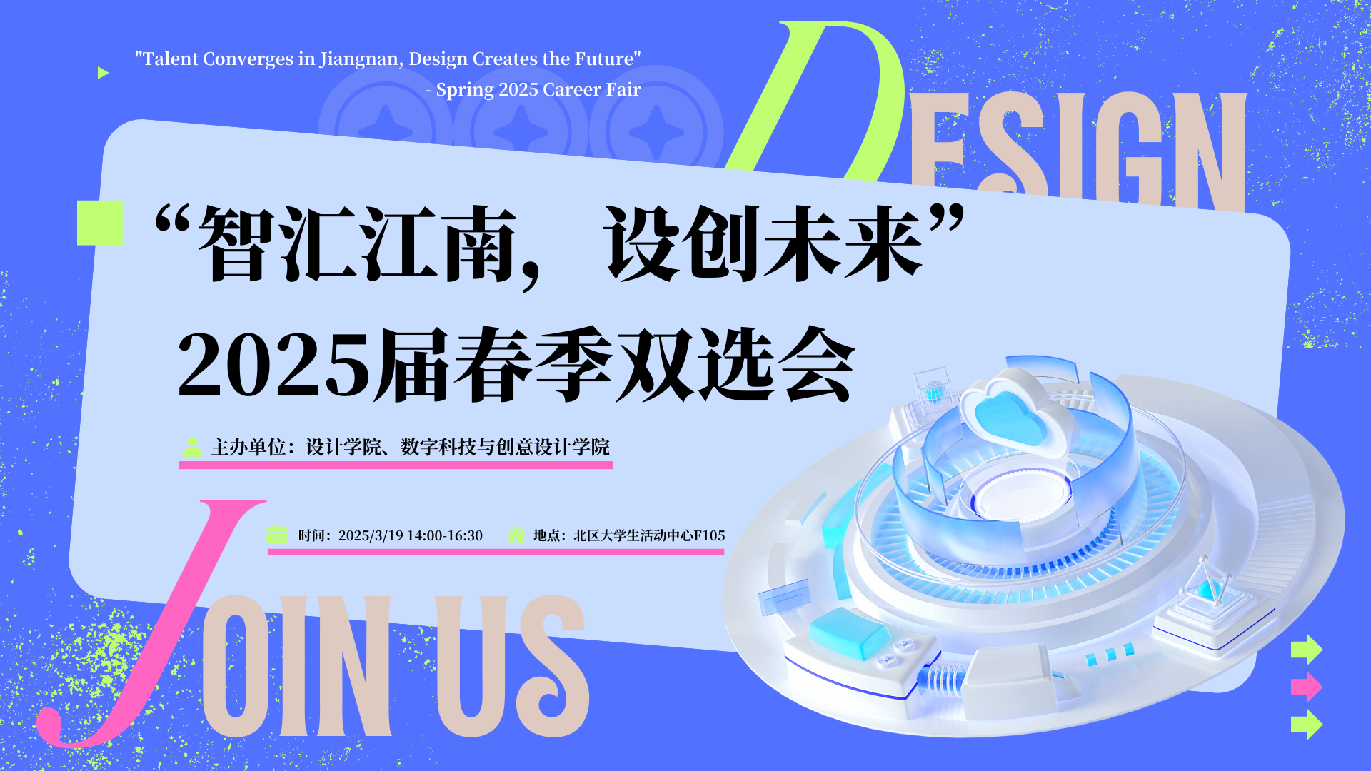 为深入贯彻党的二十大和二十届二中、三中全会精神,全面落实就业优先战略,促进高质量充分就业,我校定于2025年3月19日(周三)在江南大学举办“智汇江南,设创未来”2025届毕业生春季招聘会暨2026届实习生双选会。届时,来自设计学院、数字科技与创意设计学院的2025届本硕博毕业生将齐聚一堂,期待与贵单位共商人才发展大计,共绘职业发展蓝图。
