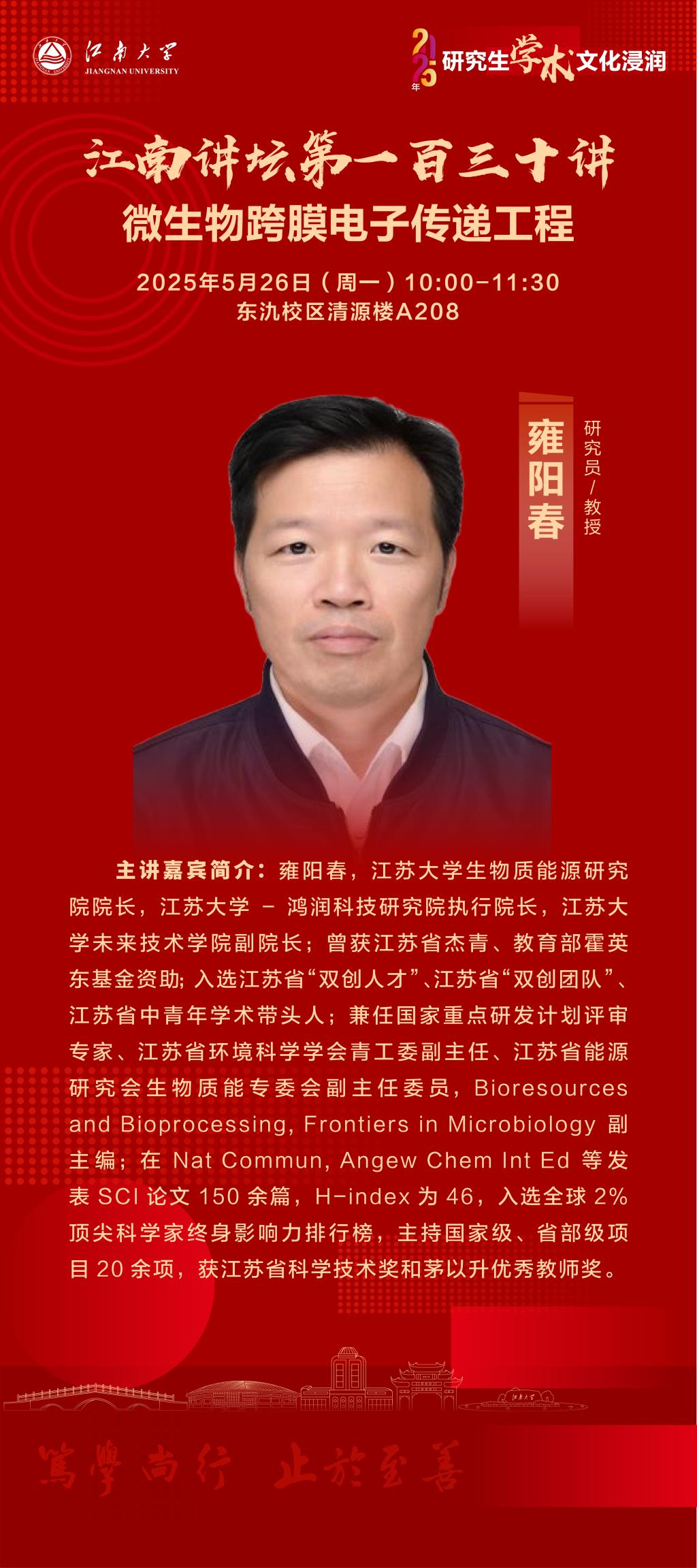 雍阳春,江苏大学生物质能源研究院院长,江苏大学-鸿润科技研究院执行院长,江苏大学未来技术学院副院长;曾获江苏省杰青、教育部霍英东基金资助;入选江苏省“双创人才”、江苏省“双创团队”、江苏省中青年学术带头人;兼任国家重点研发计划评审专家、江苏省环境科学学会青工委副主任、江苏省能源研究会生物质能专委会副主任委员,Bioresources and Bioprocessing, Frontiers in Microbiology副主编;在Nat Commun, Angew Chem Int Ed等发表SCI论文150余篇,H-index为46,入选全球2%顶尖科学家终身影响力排行榜,主持国家级、省部级项目20余项,获江苏省科学技术奖和茅以升优秀教师奖。