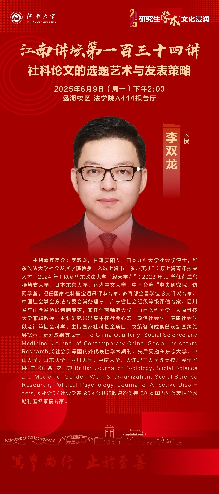 李双龙,甘肃庆阳人,日本九州大学社会学博士,华东政法大学社会发展学院教授。入选上海市“东方英才”(原上海青年拔尖人才,2024年)以及华东政法大学“经天学者”(2023年)。曾任荷兰乌特勒支大学、日本东京大学、香港中文大学、中国台湾“中央研究院”访问学者。担任国家社科基金通讯评审专家、教育部全国学位论文评议专家、中国社会学会方法专委会常务理事、广东省社会组织等级评估专家,四川省与山西省侨联特聘专家,兼任河南师范大学、山西医科大学、太原科技大学兼职教授。主要研究兴趣集中在社会心态、政治社会学、健康社会学以及计算社会科学。主持国家社科基金项目,决策咨询成果曾获副国级领导批示,研究成果发表于The China Quarterly, Social Science and Medicine, Journal of Contemporary China, Social Indicators Research, 《社会》等国内外代表性学术期刊,先后受邀在东京大学、中山大学、山东大学、四川大学、中南大学、大连理工大学等高校开展要闻60余次,兼British Journal of Sociology, Social Science and Medicine, Gender, Work & Organization, Social Science Research, Political Psychology, Journal of Affective Disorders,《社会》《社会学评论》《公共行政评论》等30本国内外代表性学术期刊匿名审稿专家。