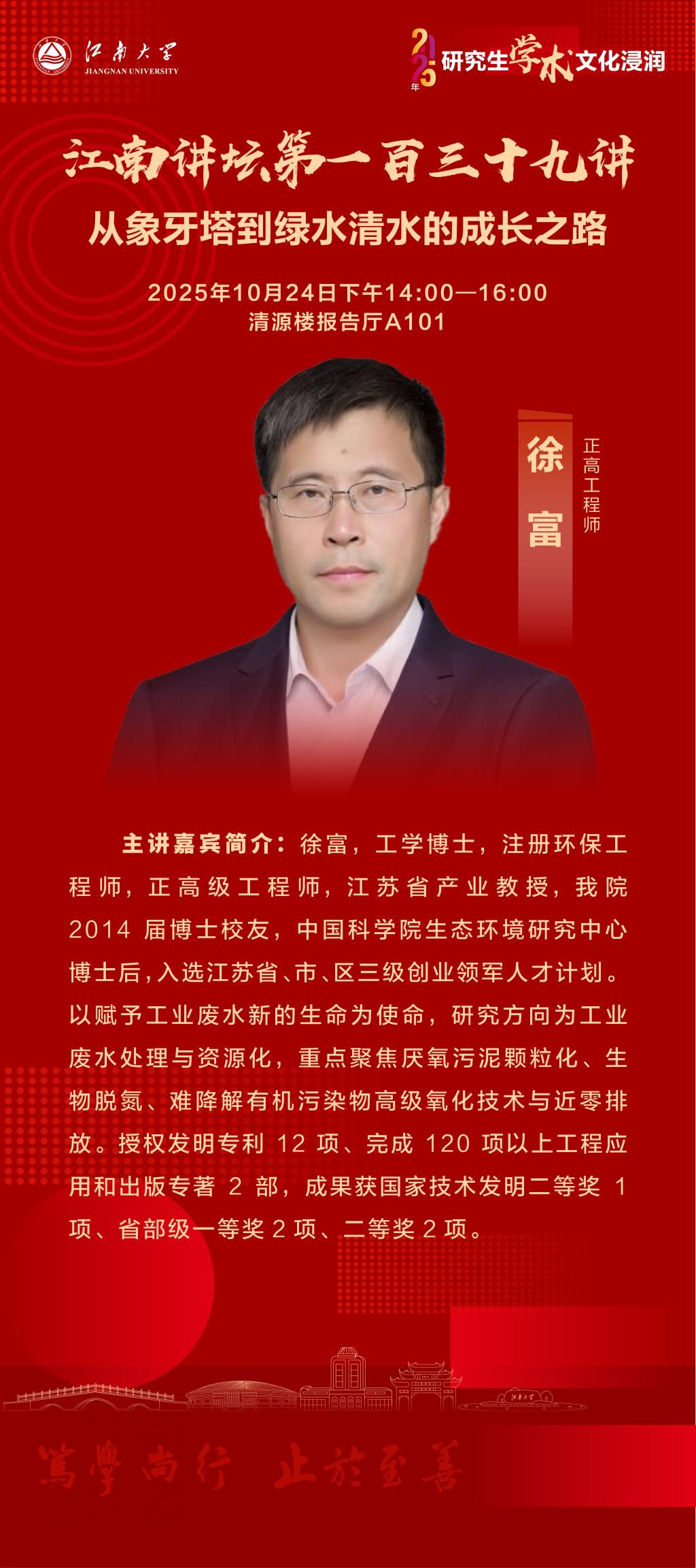 徐富,工学博士,注册环保工程师,正高级工程师,江苏省产业教授,我院2014届博士校友,中国科学院生态环境研究中心博士后,入选江苏省、市、区三级创业领军人才计划。以赋予工业废水新的生命为使命,研究方向为工业废水处理与资源化,重点聚焦厌氧污泥颗粒化、生物脱氮、难降解有机污染物高级氧化技术与近零排放。授权发明专利12项、完成120项以上工程应用和出版专著2部,成果获国家技术发明二等奖1项、省部级一等奖2项、二等奖2项。