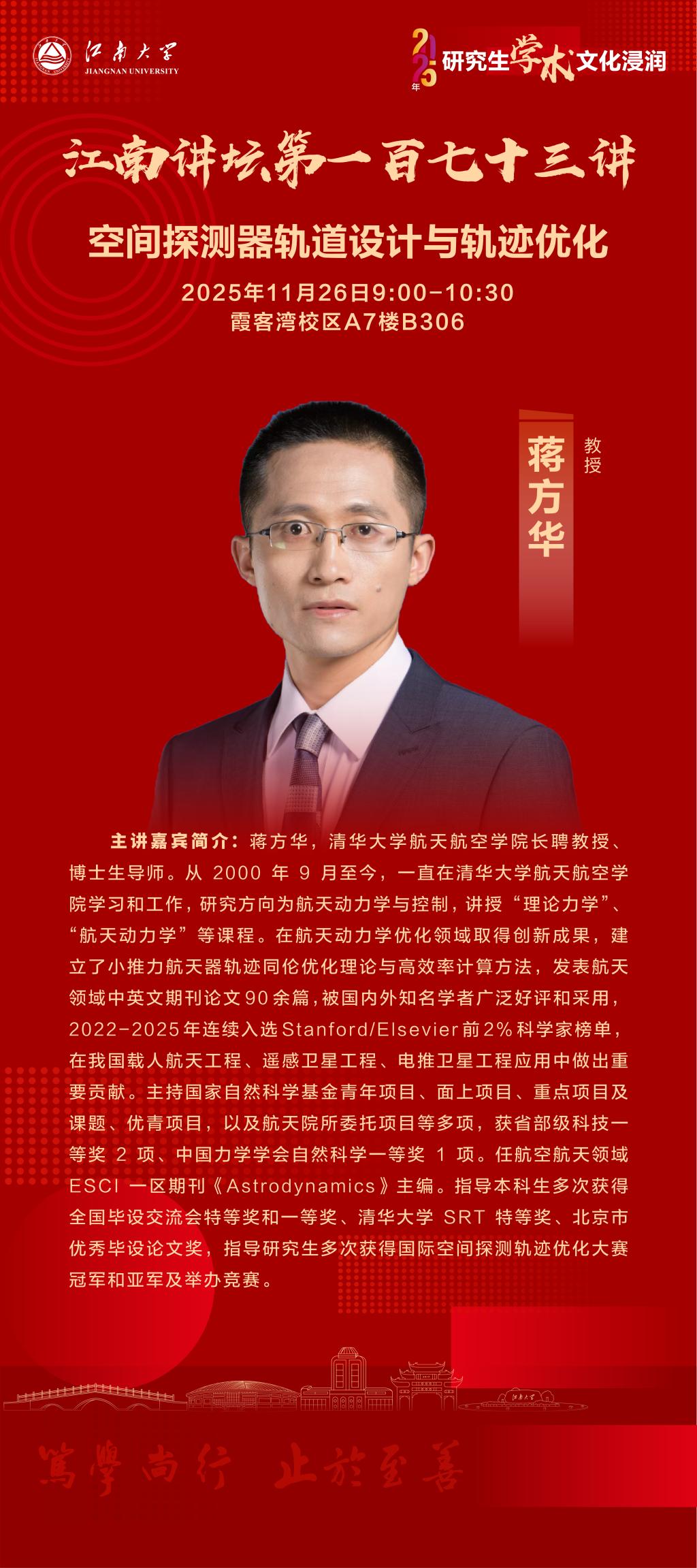蒋方华,清华大学航天航空学院长聘教授、博士生导师。从2000年9月至今,一直在清华大学航天航空学院学习和工作,研究方向为航天动力学与控制,讲授“理论力学”“航天动力学”等课程。在航天动力学优化领域取得创新成果,建立了小推力航天器轨迹同伦优化理论与高效率计算方法,发表航天领域中英文期刊论文90余篇,受到国内外知名学者广泛好评和采用,2022-2025年连续入选Stanford/Elsevier前2%科学家榜单。在我国载人航天工程、遥感卫星工程、电推卫星工程应用中做出重要贡献。主持国家自然科学基金青年项目、面上项目、重点项目及课题、优青项目,以及航天院所委托项目等多项,获省部级科技一等奖2项、中国力学学会自然科学一等奖1项。任航空航天领域ESCI一区期刊《Astrodynamics》主编。指导本科生多次获得全国毕设交流会特等奖和一等奖、清华大学SRT特等奖、北京市优秀毕设论文奖,指导研究生多次获得国际空间探测轨迹优化大赛冠军和亚军。