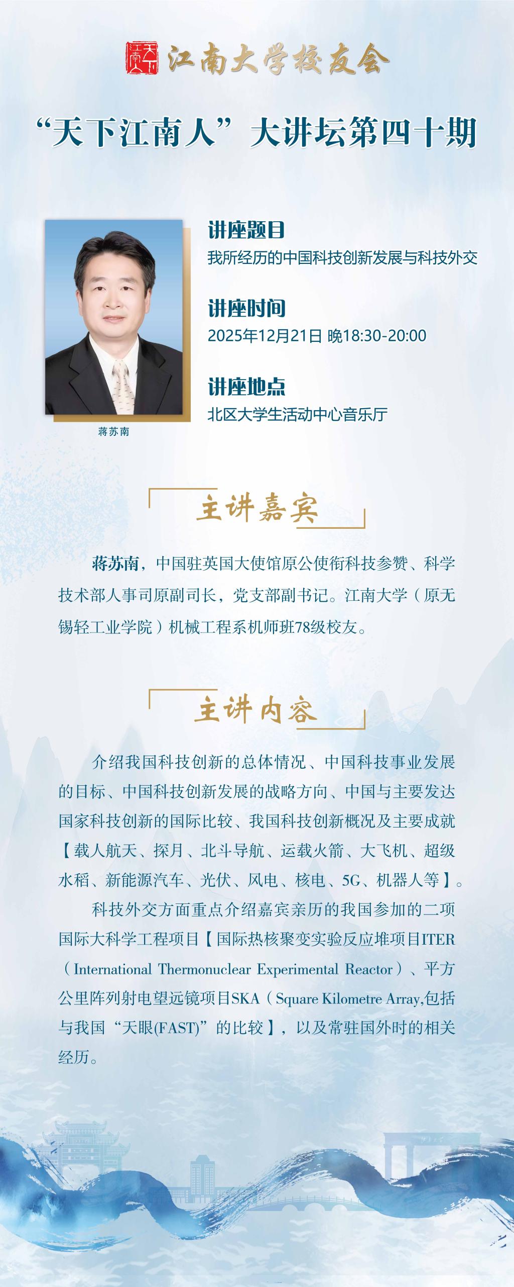 蒋苏南,中国驻英国大使馆原公使衔科技参赞、科学技术部人事司原副司长,党支部副书记。江南大学(原无锡轻工业学院)机械工程系机师班78级校友。